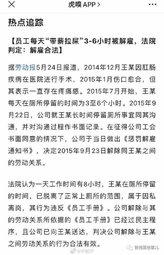 --------------《8》--------------员工每天“带薪拉屎”3-6小时被解雇,法院判定:解雇合法