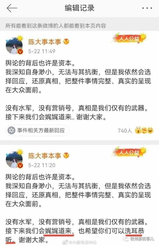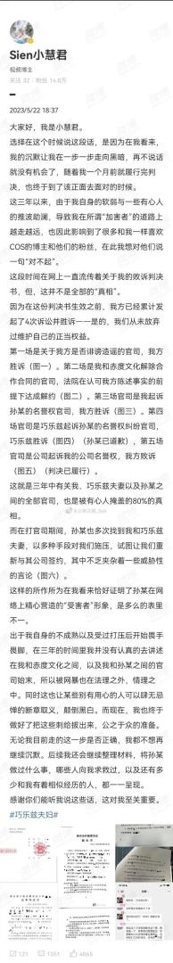 孙灏羽随后表示,刘某慧和姚某杰夫妇(巧乐兹)的指控不实,他们是出于与公司“低成本”解约目的公开造谣,已对刘某慧及和她一起“策划”造谣的姚某杰等人提起诉讼。尽管法院判决已经下来了,小慧君依旧嘴硬,坚称男方性骚扰了自己5月22日,小慧君称,自己的账号还可以登录并没有被封。她表示,是因跟黑粉争吵导致账号被处罚。5月22日,陈大事(巧乐兹夫妇 )称要向大众还原真相,舆论的背后也许是资本。 动不动就资本的人离他远点吧,还要网友洗耳恭听(第一次见洗耳恭听这么用的...,真是绝望的文盲)。跟法官说去吧,我们没兴趣。