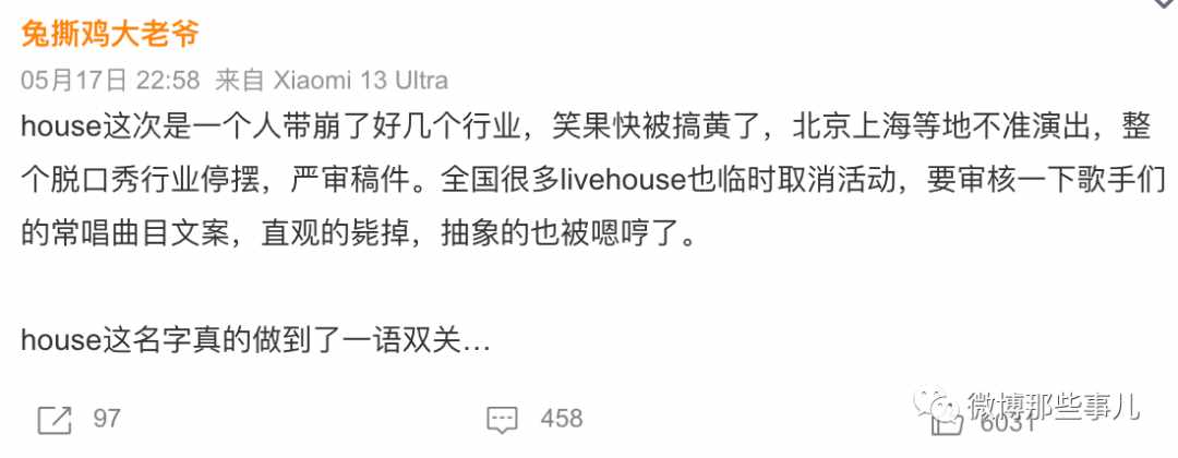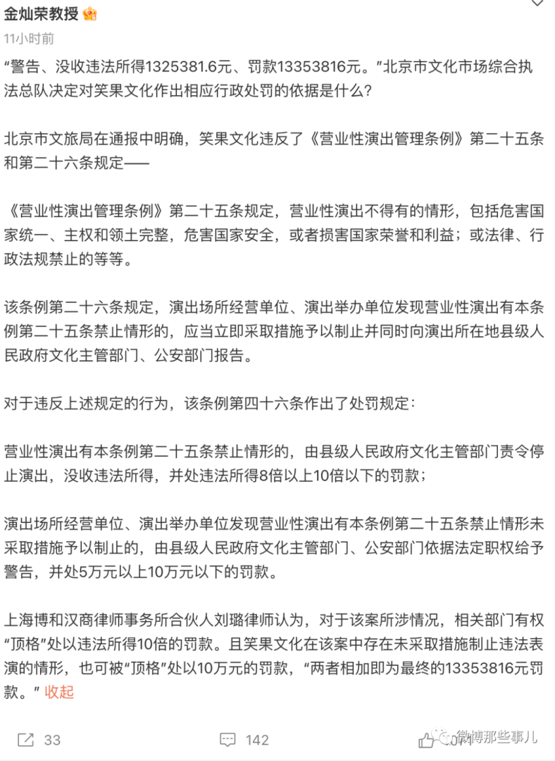 那么这是什么活动?笑果脱口秀演员house(李昊石)被这四大官媒定性了,基本是凉凉了,而且还是加急的凉。2023年5月15日,北京市文化市场综合执法总队接群众举报,决定对上海笑笙文化传媒有限公司依法立案调查。经查实,该公司及其演员李昊石肆意篡改演出申报内容,在5月13日下午、晚上连续两场“笑果脱口秀”演出中出现严重侮辱人民军队的情节,造成恶劣社会影响。北京市文化市场综合执法总队决定对该公司作出相应行政处罚:警告、没收违法所得1325381.6元、罚款13353816元。笑果在京所有演出活动无限期暂停。上海也责令其从即日起暂停在沪全部演出,立即开展内部管理整顿,配合做好立案后续处理。一开始,笑果说是脱口秀演员自己临场加的段子,把锅甩给演员个人,通报的意思是:演员讲这个段子,笑果公司也知情,要共同承担责任。这1000多万是怎么来的,金灿荣教授的微博给出了解释