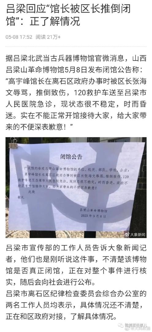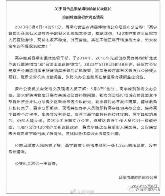 高宇峰表示,其在2020年和2021年与市区两级政府部门联合办了两个展,投了不少钱,因为索要相关款项,才发生此事。“他们是主办,我们是承办,因我找了他几次,他说我没有依据,后来说没有钱。”高宇峰称,8日上午,自己拿着文物局打的报告去离石区找张海文,被质疑报告是假的。“他说报告是假的,我就跟他吵,他拍桌子,我也拍桌子,他就把我推倒了。”高宇峰表示,被打后感觉头疼、腿疼、头晕、恶心,馆里人赶紧打了120和110。关于网传吕梁某博物馆馆长被区长推倒昏迷的初步调查情况↓↓↓