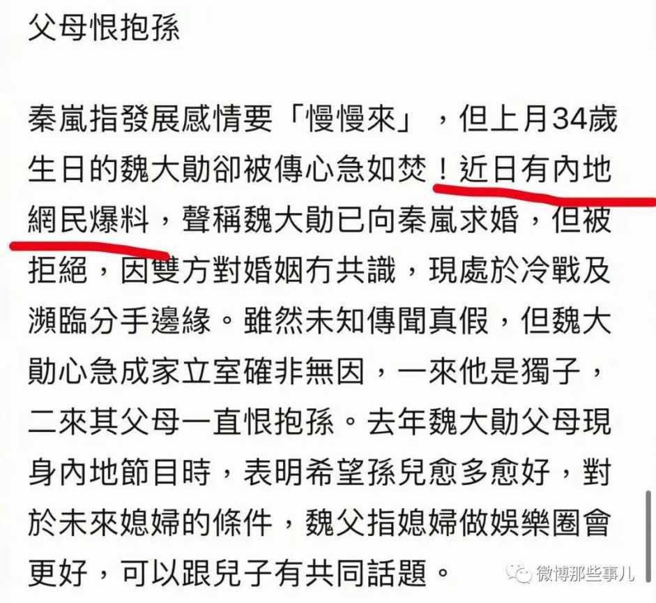 5月4日,据港媒报道,刚过完34岁生日的魏大勋向秦岚求婚被拒绝,两人也因此陷入冷战状态,感情岌岌可危。报道称魏大勋急于结婚,于是便安排向秦岚求婚,没想到却遭到秦岚的当场拒绝,原因是秦岚觉得双方对于婚姻没有达成共识,不能急于结婚,秦岚的拒绝也让她和魏大勋的感情陷入僵局,目前两人正处于冷战状态,随时都面临分手。港媒:近日有内地网民爆料秦岚拒嫁魏大勋