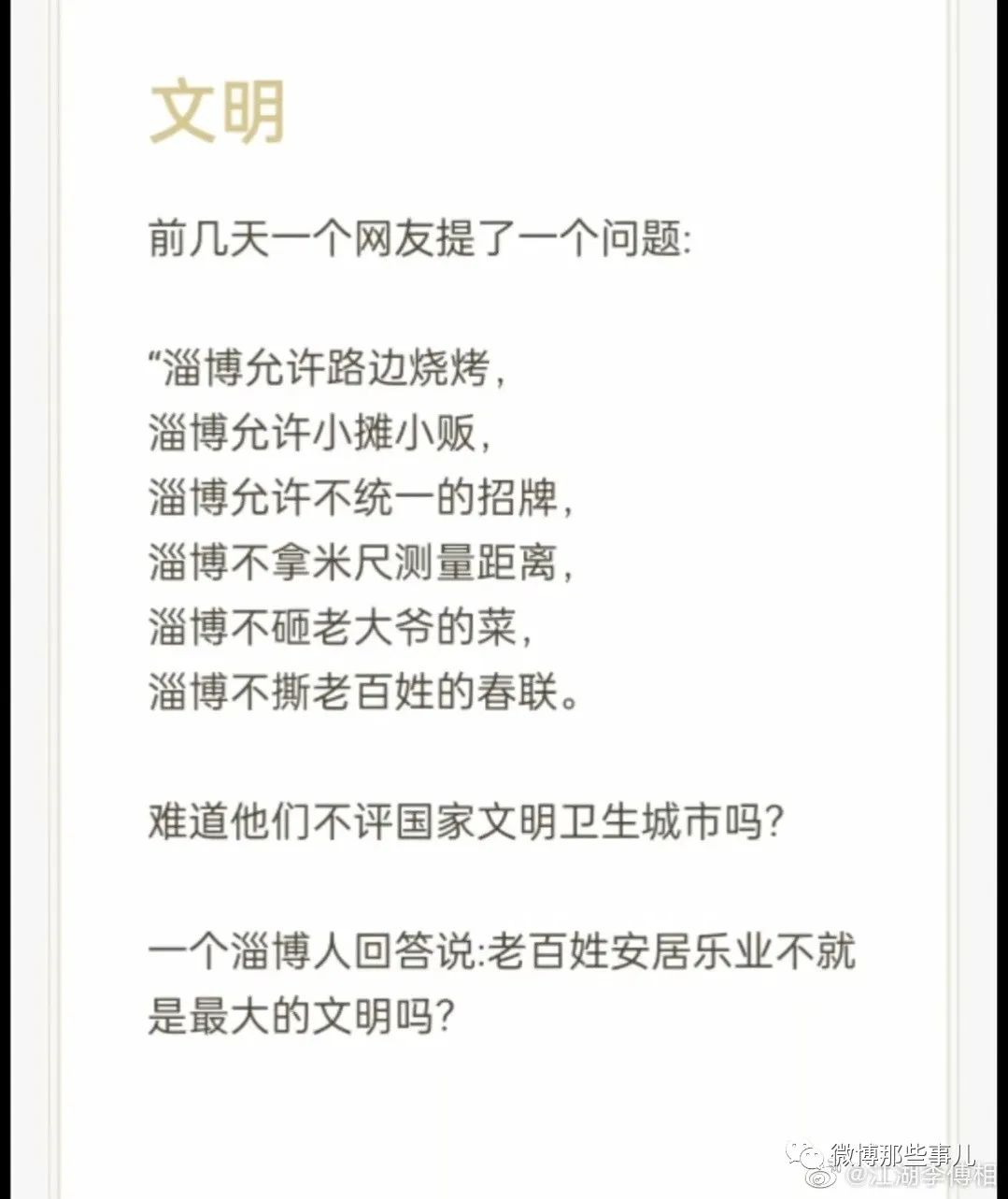 据淄博本地土著称,网上流传的这个总结大部分情况属实。网友对淄博的评价“一个老实孩子,突然被夸了,兴奋地拿出他所有的好东西和热情招待客人…...”说得真好看看淄博这个,你再想想之前那个新闻“为什么民宿涨价毁约潮无法控制?”