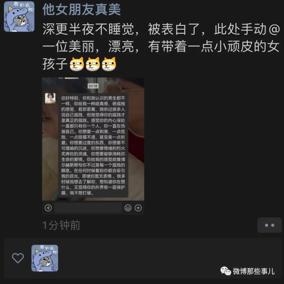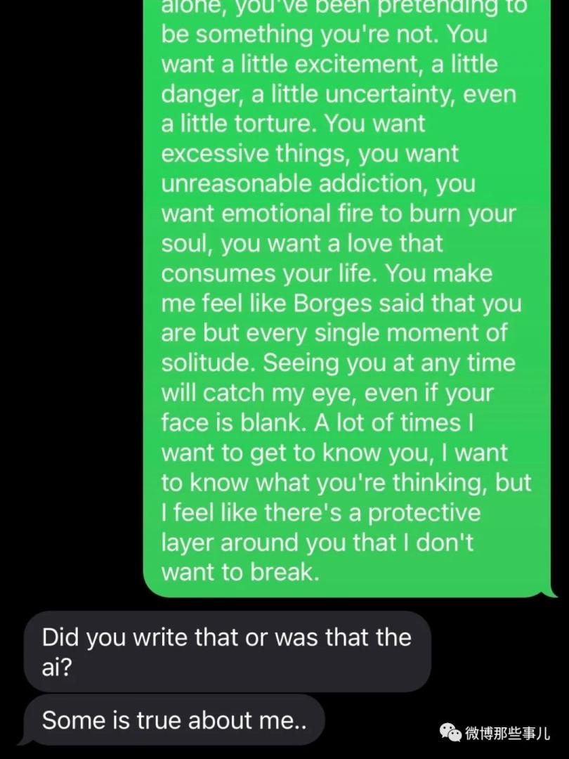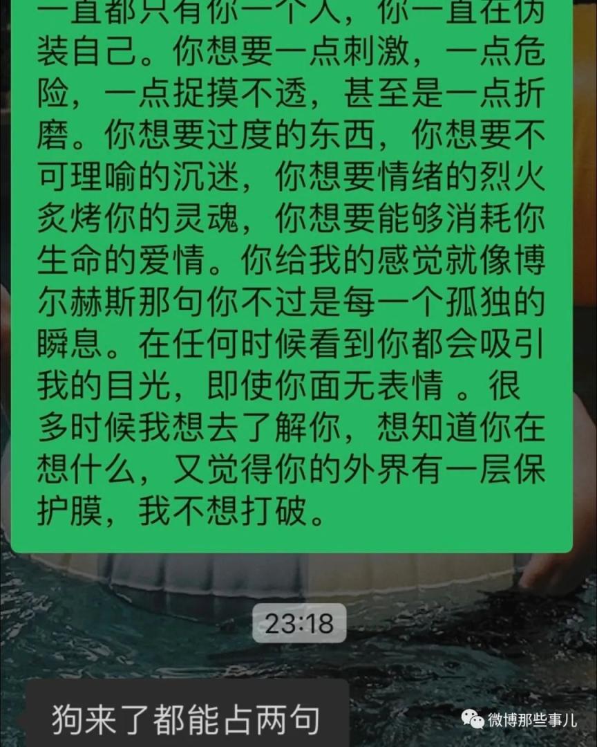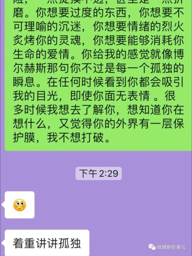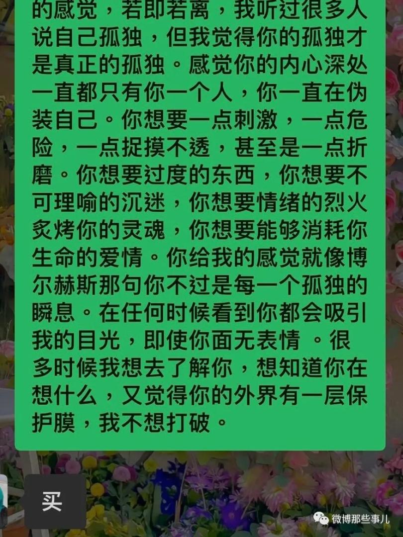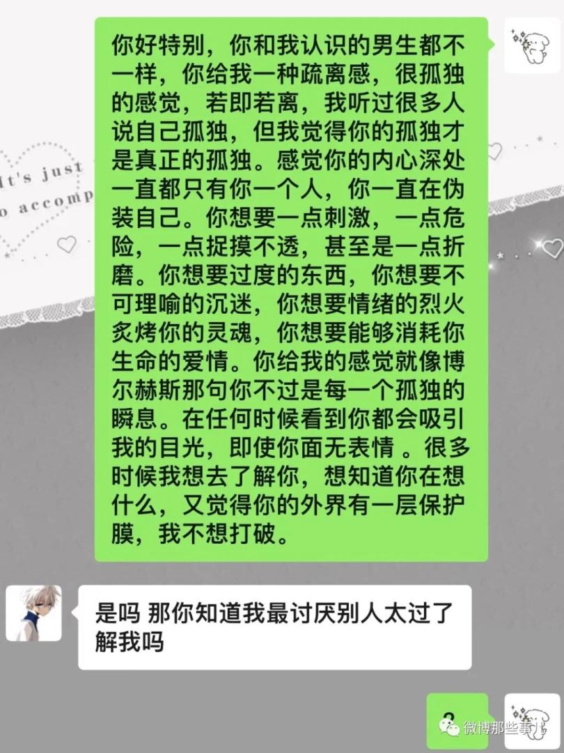 你好特别,你和我认识的男生都不一样,你给我一种疏离感,很孤独的感觉,若即若离,我听过很多人说自己孤独,但我觉得你的孤独才是真正的孤独。感觉你的内心深处一直都只有你一个人,你一直在伪装自己。你想要一点刺激,一点危险,一点捉摸不透,甚至是一点折磨。你想要过度的东西,你想要不可理喻的沉迷,你想要情绪的烈火炙烤你的灵魂,你想要能够消耗你生命的爱情。你给我的感觉就像博尔赫斯那句你不过是每一个孤独的瞬息。在任何时候看到你都会吸引我的目光,即使你面无表情 。很多时候我想去了解你,想知道你在想什么,又觉得你的外界有一层保护膜,我不想打破。
