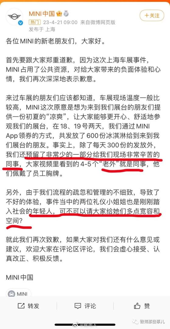 ,宝马MINI呼吁给发冰淇淋小姐姐多些宽容,这看似是在替两位员工请求宽容,其实是在转移矛盾,把视线从公司的管理、沟通等问题转移到员工身上,想把自己置身事外,“责任在员工,不在公司”。