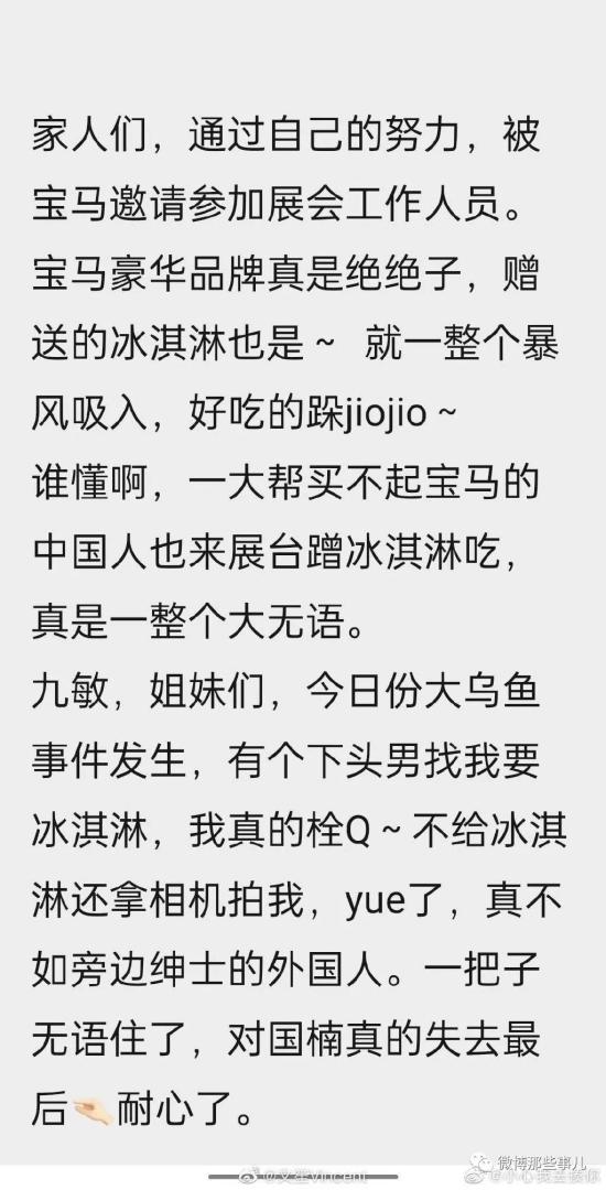 宝马mini冰淇淋事件崇洋媚外引发网友众怒,宝马一招化解:改发钥匙扣! 伦理电影 2026-01-16 06:34:10 309 0 请各位看官关注下小编本人的备用号,每天也会更新,还有留言功能近日,网传上海车展“MINI”@MINI中国 展台疑似区别对待访客一事引发网友热议。网传视频显示,两名女性工作人员在展台发放冰淇淋,对于前去询问冰淇淋的国人访客拒绝提供,表示冰淇淋已发放完。随后一名外国访客上前询问,工作人员通过简单交流后,从保温箱里取出一盒冰淇淋给到对方。现场有访客对该行为表示质疑后,一名男性工作人员上前将放置冰淇淋的保温箱抱走,该视频上传网络后引发众多网友不满。两女的把崇洋媚外表现的淋漓尽致,醒醒,都2023年了两个女的恨不得见到老外就舔上去 这和前几天,宝马喊出的口号,形成鲜明的对比。………… 花了几千万的宝马之夜,又花了几千万的上海车展,结果栽到35块钱一盒的冰淇淋上,宝马市值蒸发了21.6亿,还是欧元有人买了两大兜冰淇淋去展台附近免费发放~~~青年报太绝了,直接搬来了冰柜!其他车商也没闲着上海车展宝马mini冰淇淋事还没完,展台那边又传来保安驱逐、打人事,该主播被推出展厅,强制关闭了直播!上海市公安局青浦分局国家会展中心治安派出所民警回应此事表示,“事实没有网传那么严重。”对于宝马如何挽回形象,微博网友出了很多注意宝马用一招就完成了逆转:发钥匙扣 伦理片伦理电影伦理片网站韩国伦理片日本伦理片韩国伦理电影日本伦理电影 << 大厂为了防厕所摸鱼有多拼,为此还单独研发了一个系统? 最新韩国伦理电影免费下载 >> 您可以还会对下面的文章感兴趣: 大厂为了防厕所摸鱼有多拼,为此还单独研发了一个系统? 90后父母专治各种不服,再甜不能甜孩子,再苦不能苦自己 【今日爆笑动态图】刚试了试,被人追了二里地 每棵树好像都有自己的想法,学一点树语,轻松读懂树木! 淄博烧烤风波,男子凌晨三点排队取得号,排到座位后,被一位女士占了 你们可能想象不到,这段视频在国外非常火,老外:中国功夫! 编剧史航被至少12名女性控性骚扰,史航称和几个当事人有不同程度交往! 云南抹黑节,把路人抹黑代表祝福,洗了一百个孩子没洗到自家孩子 【今日爆笑大集合】兄弟们,一个相当炸裂的故事,不是一家人不进一家门 地铁构陷女没被开除,双一留了,媒体质疑川大处理结果:失焦且碎片化 相关文章 最新韩国伦理电影免费下载 宝马mini冰淇淋事件崇洋媚外引发网友众怒,宝马一招化解:改发钥匙扣! 大厂为了防厕所摸鱼有多拼,为此还单独研发了一个系统? 伦理电影网会员限时免费开放 90后父母专治各种不服,再甜不能甜孩子,再苦不能苦自己 伦理电影免费下载最新网址 【今日爆笑动态图】刚试了试,被人追了二里地 每棵树好像都有自己的想法,学一点树语,轻松读懂树木! 最新评论 ◎欢迎参与讨论,请在这里发表您的看法、交流您的观点。 内容 昵称 邮箱 网址 取消回复