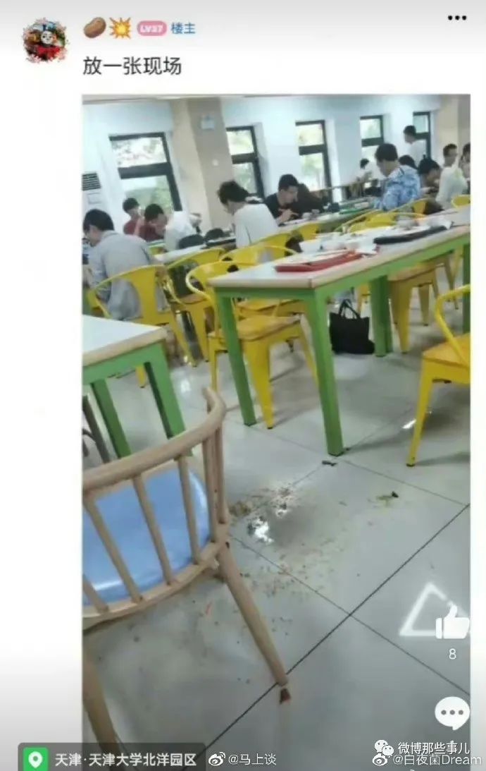 天津大学的监控视频,从视频上看白衣男生和女生没有任何交流,毫无关系,女生莫名其妙的绕到白衣男生背后,把一盘烧鸭饭狠狠地扣在白衣男生头上,估计白衣男生当时都被吓懵了……随后三位男生追了上去另一个监控视频拍到女子逃跑的画面,简直就是风一样的女子~男生追出去理论还被她扇了一巴掌,报警后警察来了只调解,让女生赔了300元,也没事公开道歉...