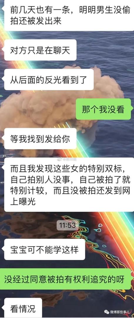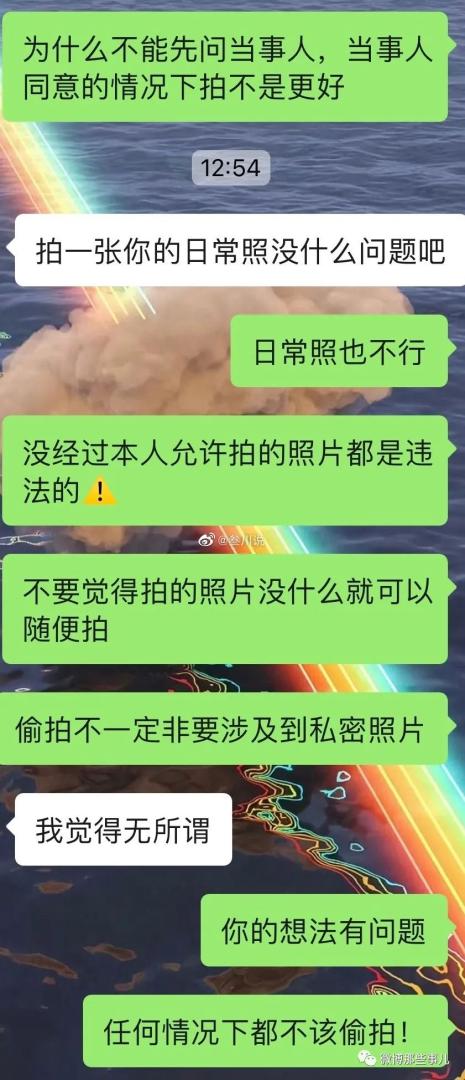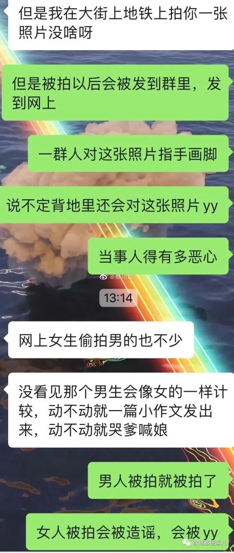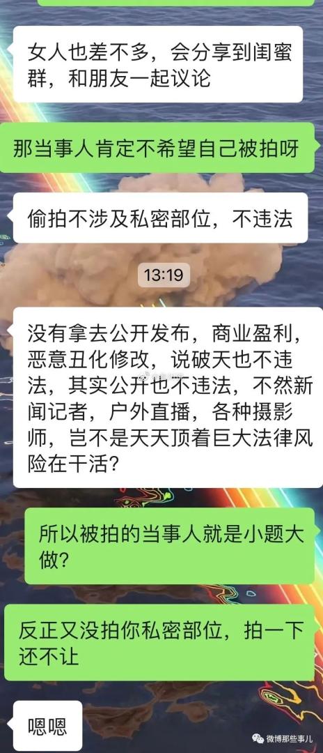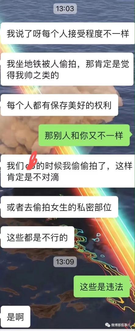 :你俩都不太正常,槽点太多。男的没意识到就算只是拍个脸也算偷拍,因为别人没同意,女的说出了偷拍女的不行,偷拍男的没事,这俩都挺逆天的